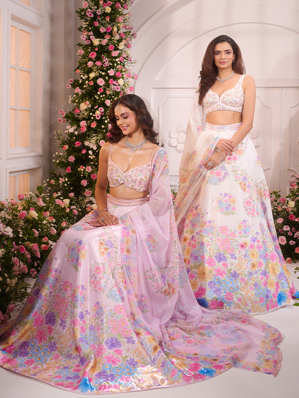 Pink Flower Printed Embroidered Lehenga SetPink Flower Printed Embroidered Lehenga Set