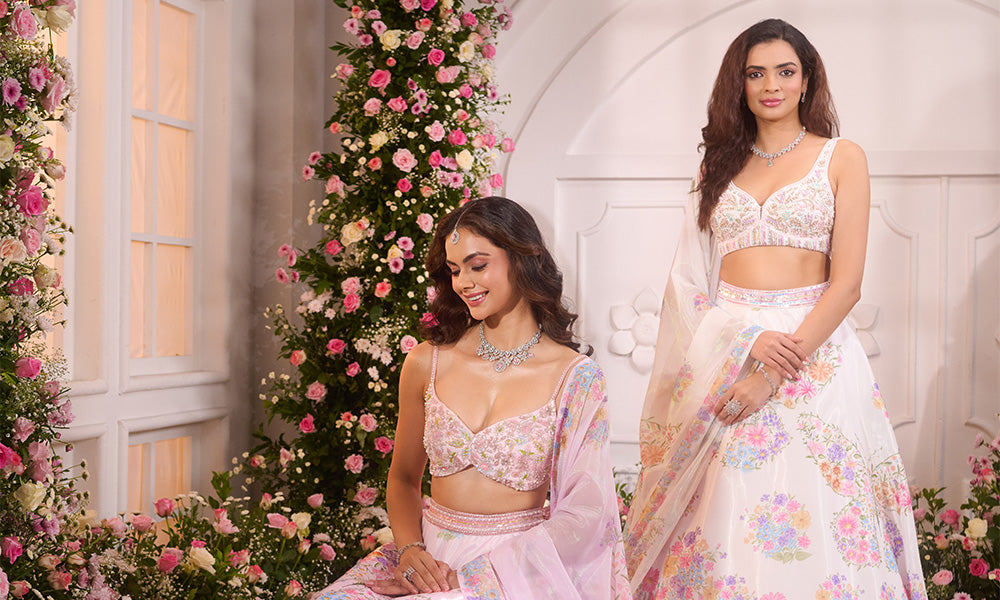 Bloom in grace with this pink floral printed lehenga set, a vision of feminine charm and timeless beauty. Delicately adorned with fine beadwork and crystal embellishments, the ensemble radiates subtle sparkle and sophistication. Designed on a flattering silhouette, it captures the essence of elegance...