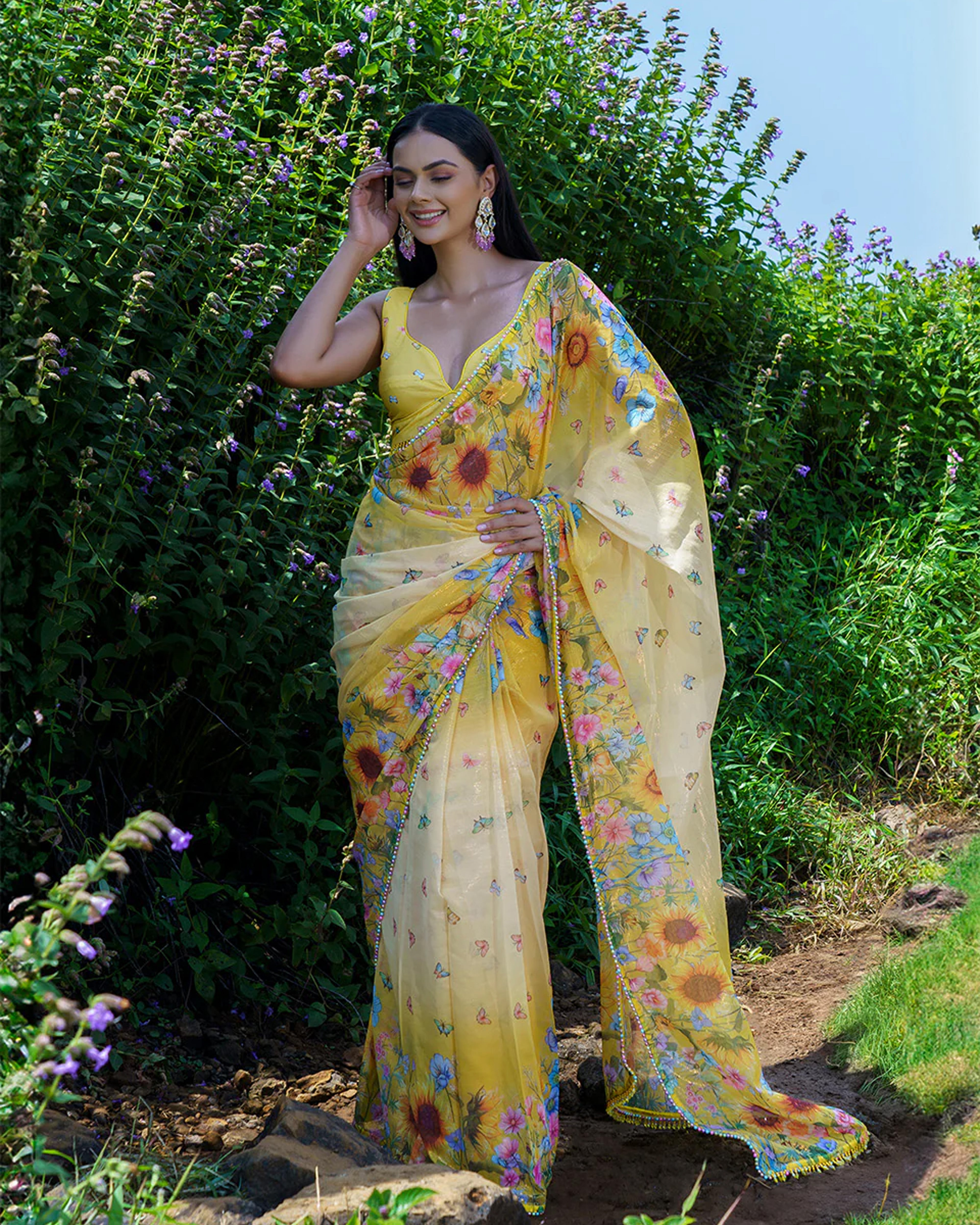 Brighten up your occasion wardrobe with this yellow floral embroidered pre-drape saree set, blending traditional charm with contemporary ease. Crafted for effortless elegance, the saree features intricate floral embroidery and is thoughtfully enhanced with handwork embellishments that elevate its overall appeal. Perfect for haldi ceremonies, festive gatherings, or destination weddings, this ready-to-wear saree offers both comfort and style. Pair it with statement earrings and minimal makeup for a fresh, radiant ethnic look.